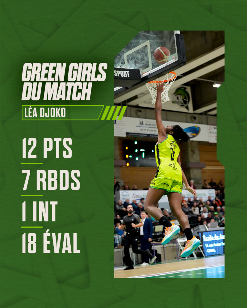 Léa Djoko est élue Green Girls du match, elle cumule 𝟭𝟮 𝗽𝗼𝗶𝗻𝘁𝘀, 𝟳 𝗿𝗲𝗯𝗼𝗻𝗱𝘀, 𝟭 𝗶𝗻𝘁𝗲𝗿𝗰𝗲𝗽𝘁𝗶𝗼𝗻, 𝗽𝗼𝘂𝗿 𝟭𝟴 𝗲́𝘃𝗮𝗹𝘂𝗮𝘁𝗶𝗼𝗻𝘀 !