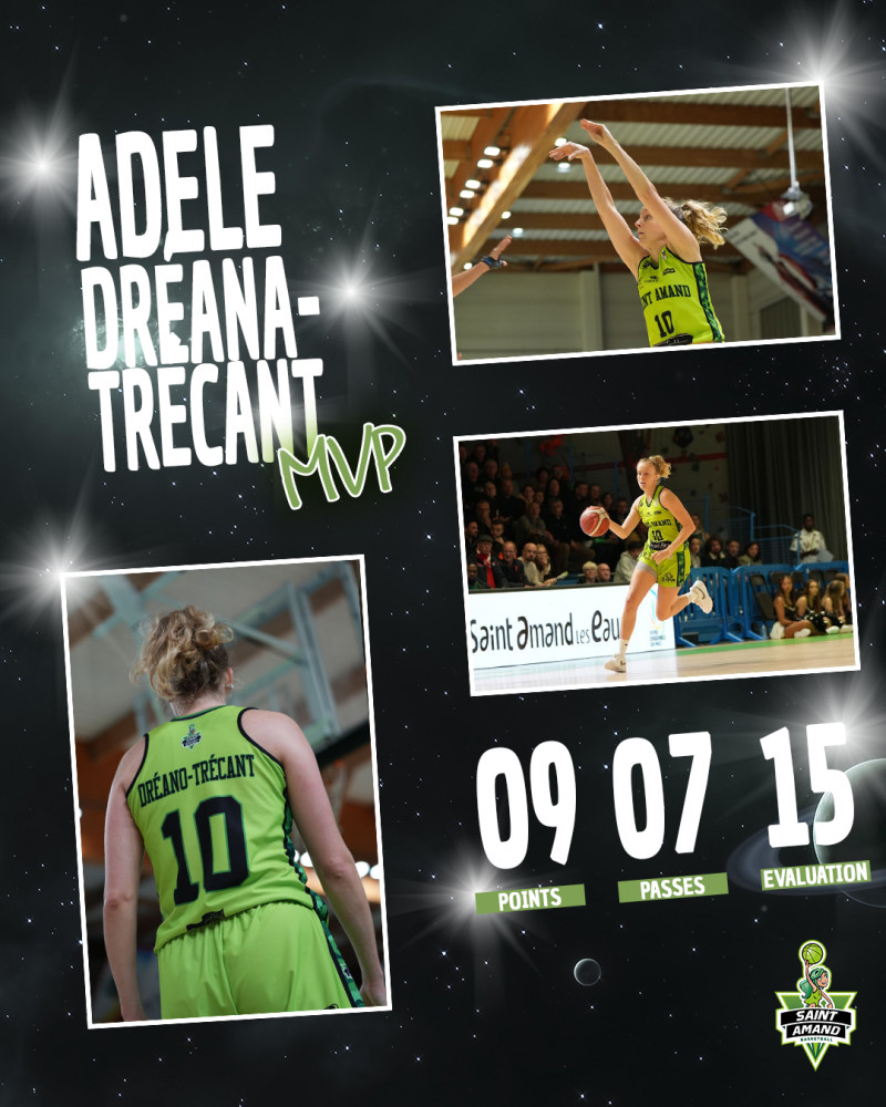 Adèle Dréano-Trécant est élu MVP du match, elle cumule 𝟵 𝗽𝗼𝗶𝗻𝘁𝘀, 𝟯 𝗿𝗲𝗯𝗼𝗻𝗱𝘀, 𝟳 𝗽𝗮𝘀𝘀𝗲𝘀 𝗱𝗲́𝗰𝗶𝘀𝗶𝘃𝗲𝘀 𝗽𝗼𝘂𝗿 𝟭𝟱 𝗱'𝗲́𝘃𝗮𝗹𝘂𝗮𝘁𝗶𝗼𝗻𝘀 !
